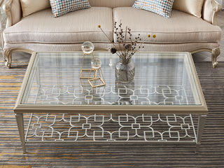 艾美侈 美式 进口榉木+镂空金属层架+玻璃 香滨银 1.422米长方形咖啡桌茶几