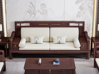美檀家居 新中式 进口黑檀木+仿真皮+高回弹海绵+多层实木板+电镀五金 黑檀色 三人位 2.66米沙发