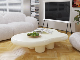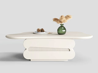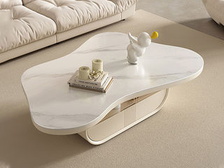 云端 奶油风 实木多层板弯板+E1板材,亮光雪山石岩板 奶白色 1.3米茶几