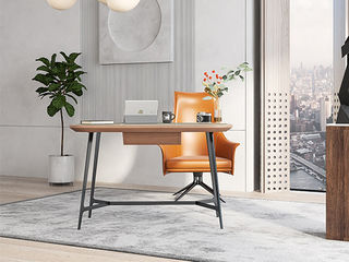 缔造 极简 E1级中纤板贴深胡桃木皮+马鞍硬皮+不锈钢灰钛底架 书桌