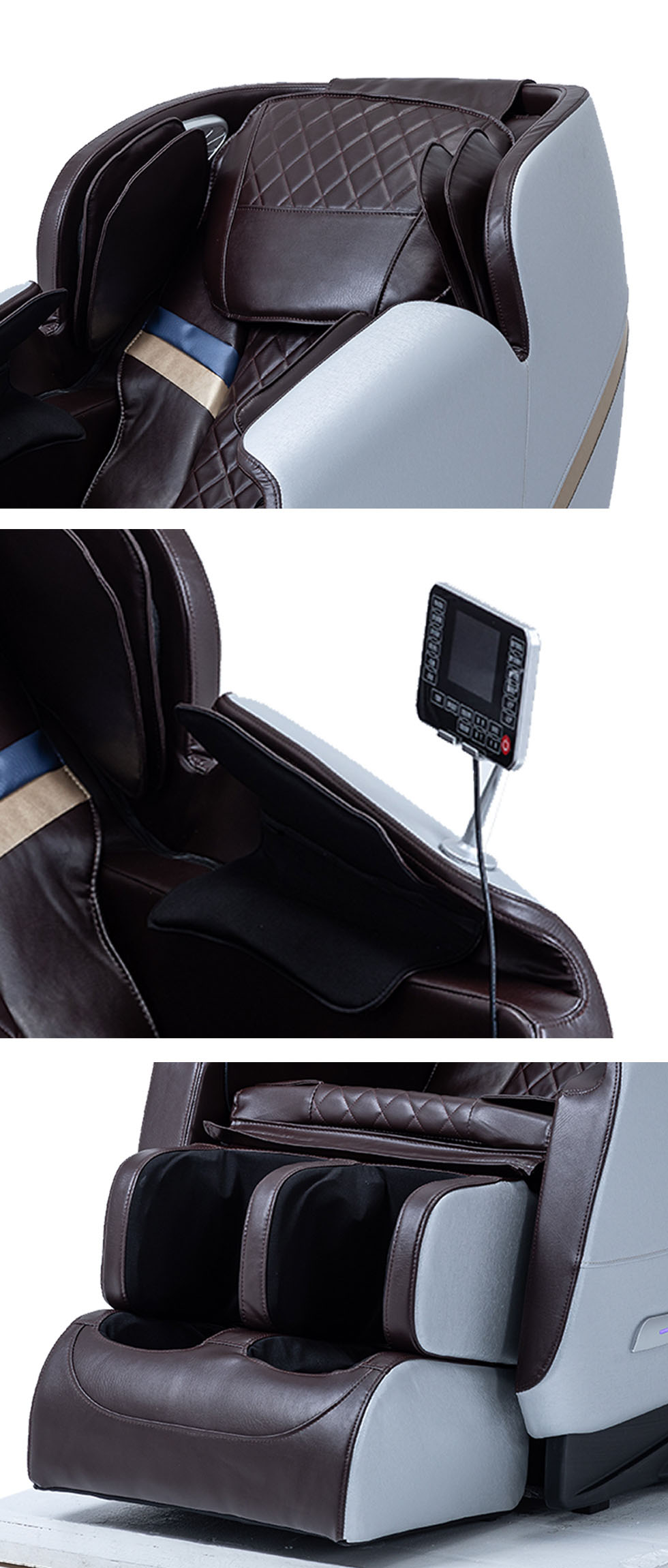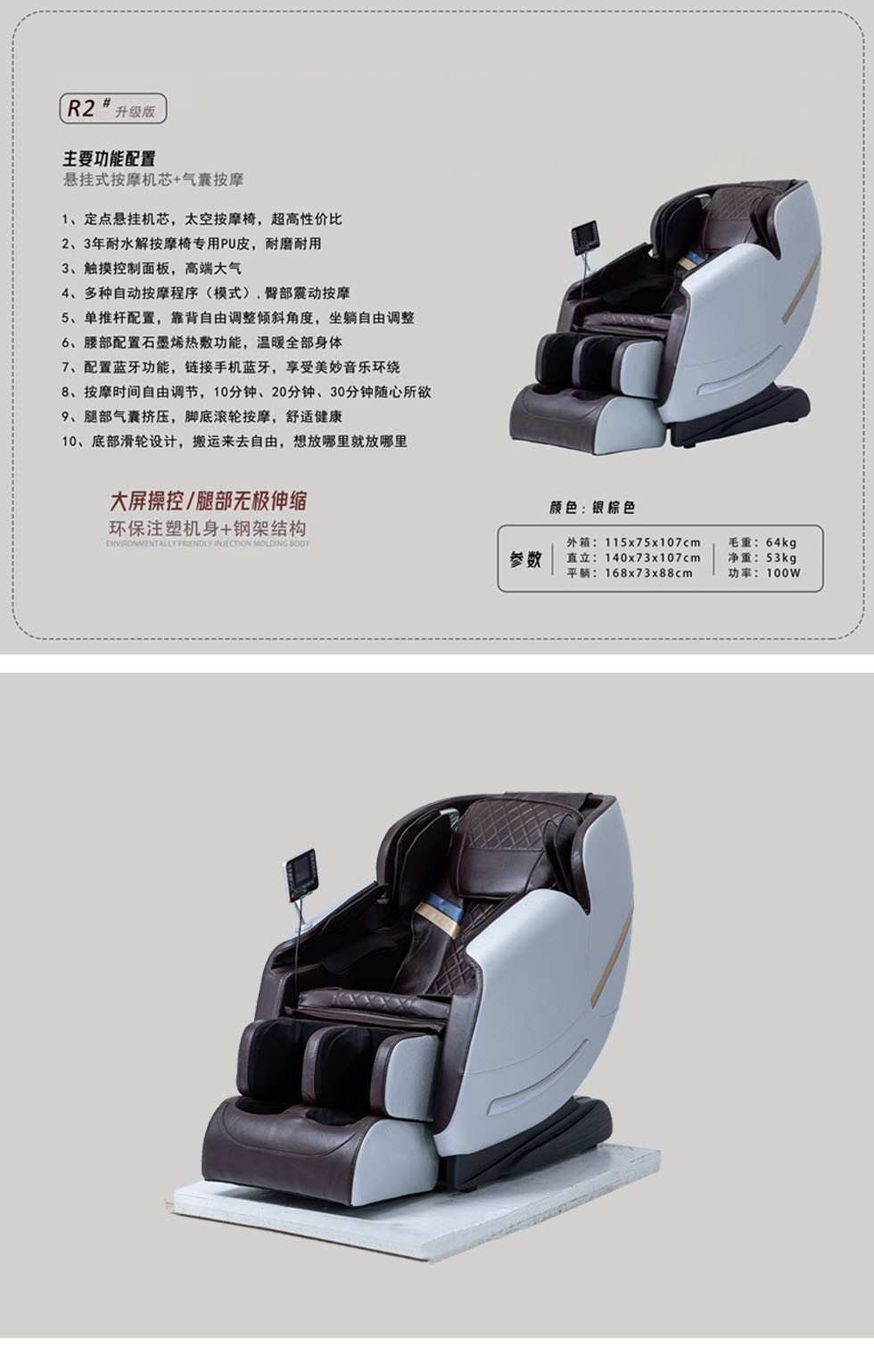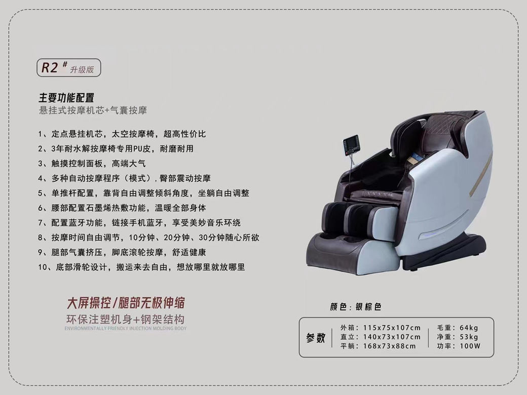 摩锐 现代简约 环保注塑机身+钢架结构+PU皮+定点悬挂机芯+触摸控制面板+蓝牙+音响 银棕色 按摩椅