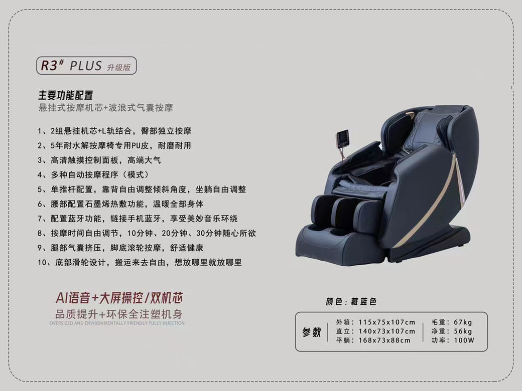 摩锐 现代简约 环保注塑机身+钢架结构+PU皮+2组悬挂机芯+触摸控制面板+蓝牙+音响 藏蓝色 按摩椅