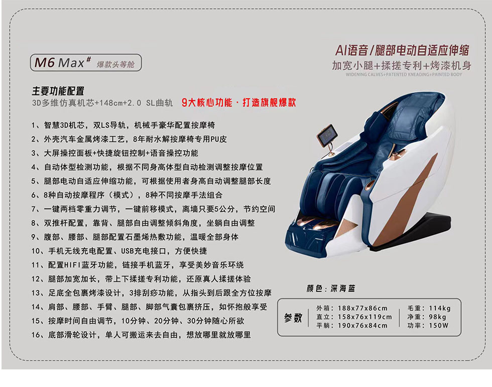 摩锐 现代简约 环保注塑机身+钢架结构+PU皮+3D机芯+一键零重力调节,太空舱般体验+脚底刮痧功能+自动体型检测 深海蓝 按摩椅 |