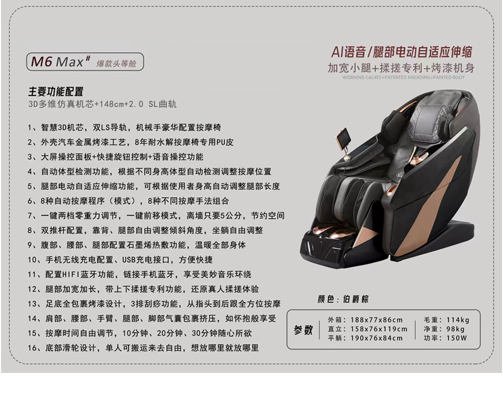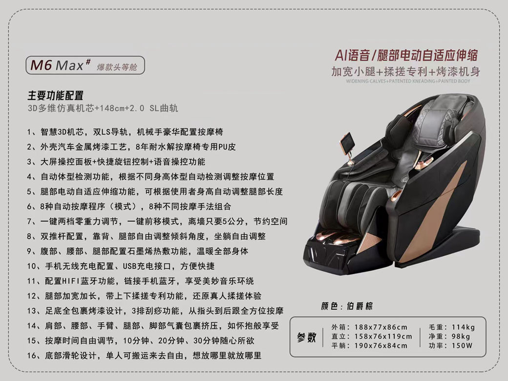 摩锐 现代简约 环保注塑机身+钢架结构+PU皮+3D机芯+一键零重力调节,太空舱般体验+脚底刮痧功能+3D光感扫描体型检测 伯爵棕 按摩椅