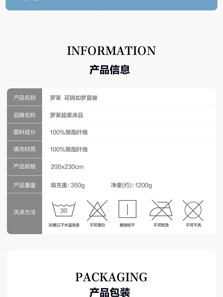 | 规格:200*230cm | 面料:面料材质:100%聚酯纤维 | 填充物:填充材质:100%聚酯纤维 |
