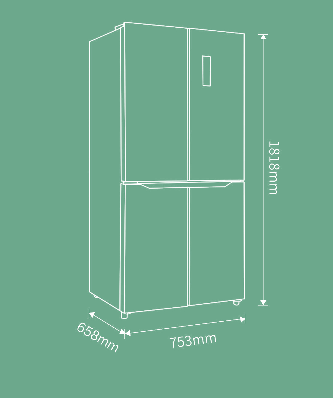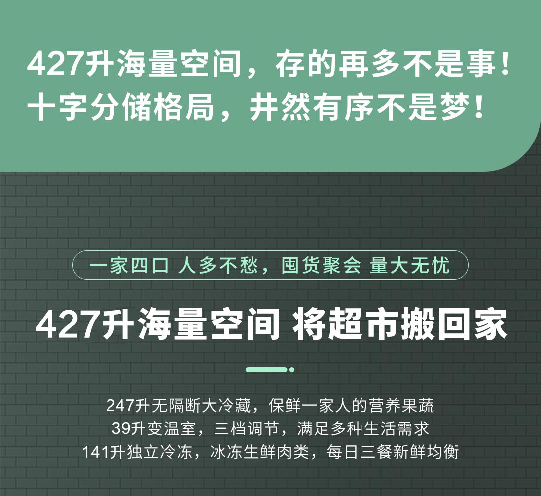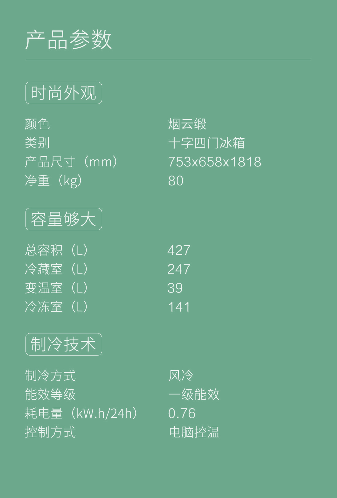 | 外形尺寸:753x658x1818mm | 制冷方式:风冷(无霜) | 总容积(升):427 |