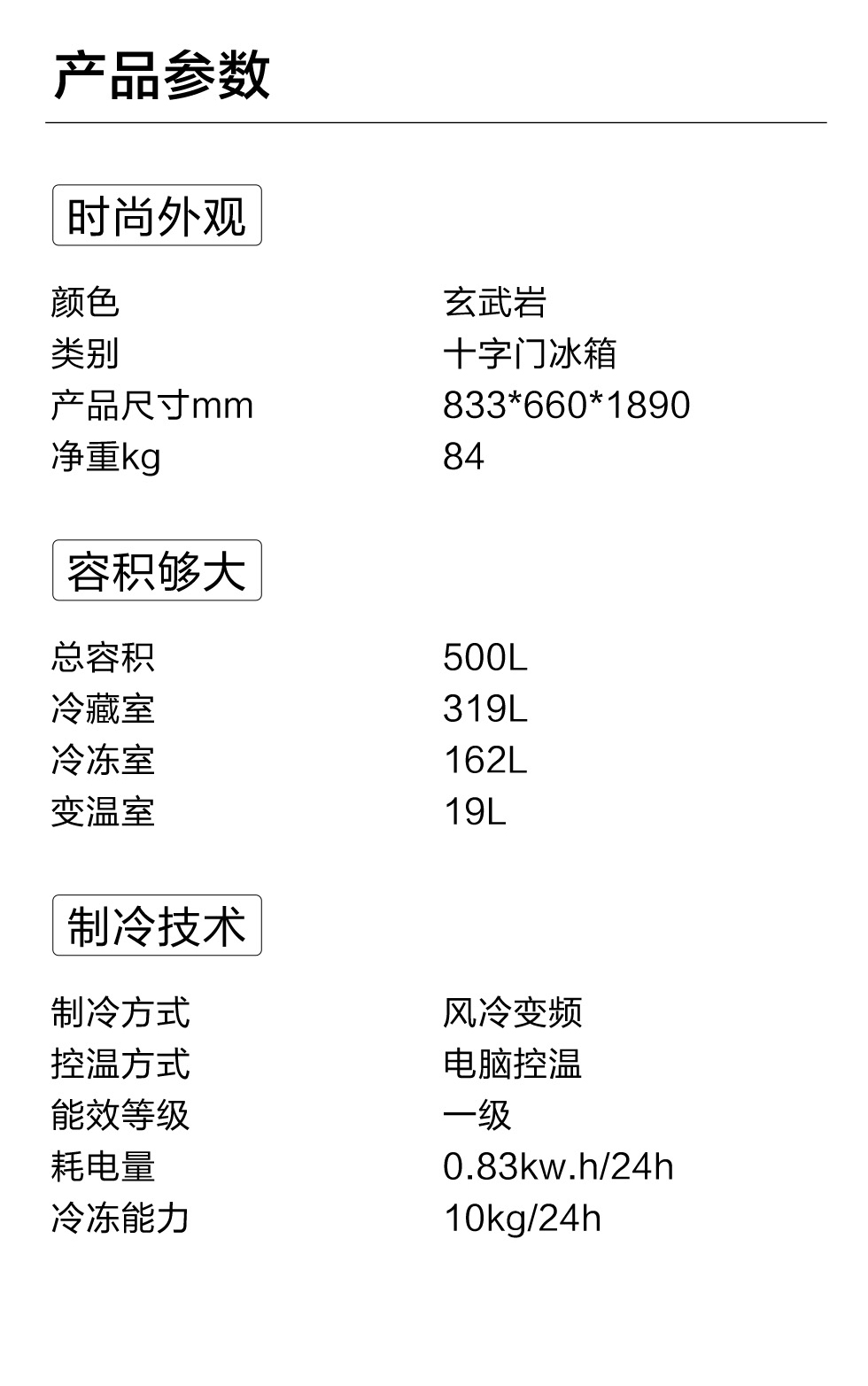 | 外形尺寸:833*660*1890mm | 制冷方式:风冷(无霜) | 总容积(升):500 |