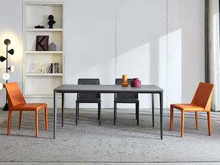 B系优选 极简 餐桌:不锈钢+岩板 1.4米 餐椅:西皮+骨架:五金材质1.4米餐桌+4把餐椅(含底板)