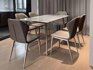 B系优选 现代简约 餐桌:碳素钢底座+12mm马肚形岩板+多层板底板 餐椅:碳素钢底座+PU皮 1.4米餐桌+4把餐椅(含底板)
