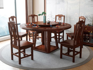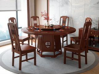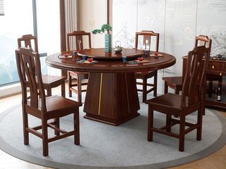 宝瑞·檀风 新中式 印尼金花梨木框架+多层实木板贴皮+转盘+玻璃 紫檀色 1.4米餐桌