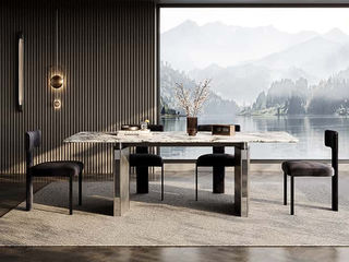 洛萨 现代 不锈钢脚架+木纹+单板+水晶白奢石 1.4米餐桌