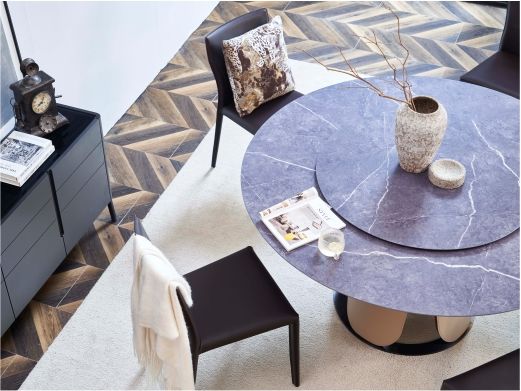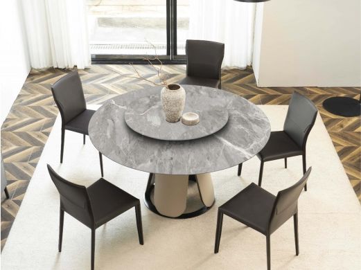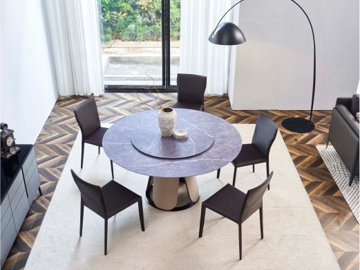 缔造 极简 宝格丽白天然石 + 不锈钢电镀灰钛 1.3米圆餐桌含转盘