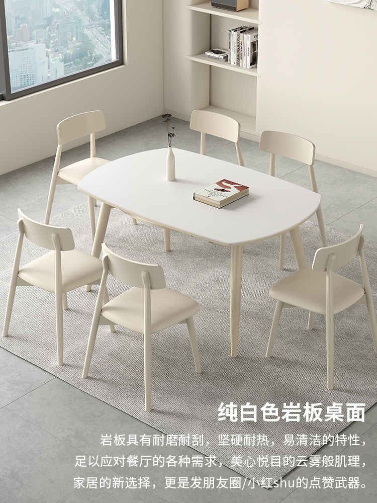 云端 奶油风 实木脚烤漆+亮光岩板面 多层板底板 奶白色 1.4米餐桌¥3446