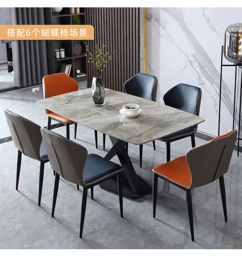 B系优选 现代简约 餐桌:12mm亮光奶油色岩板面+高密度板+烤漆+不锈钢脚 餐椅:铁艺框架+西皮靠背 1.4米餐桌+4把餐椅(含底板)