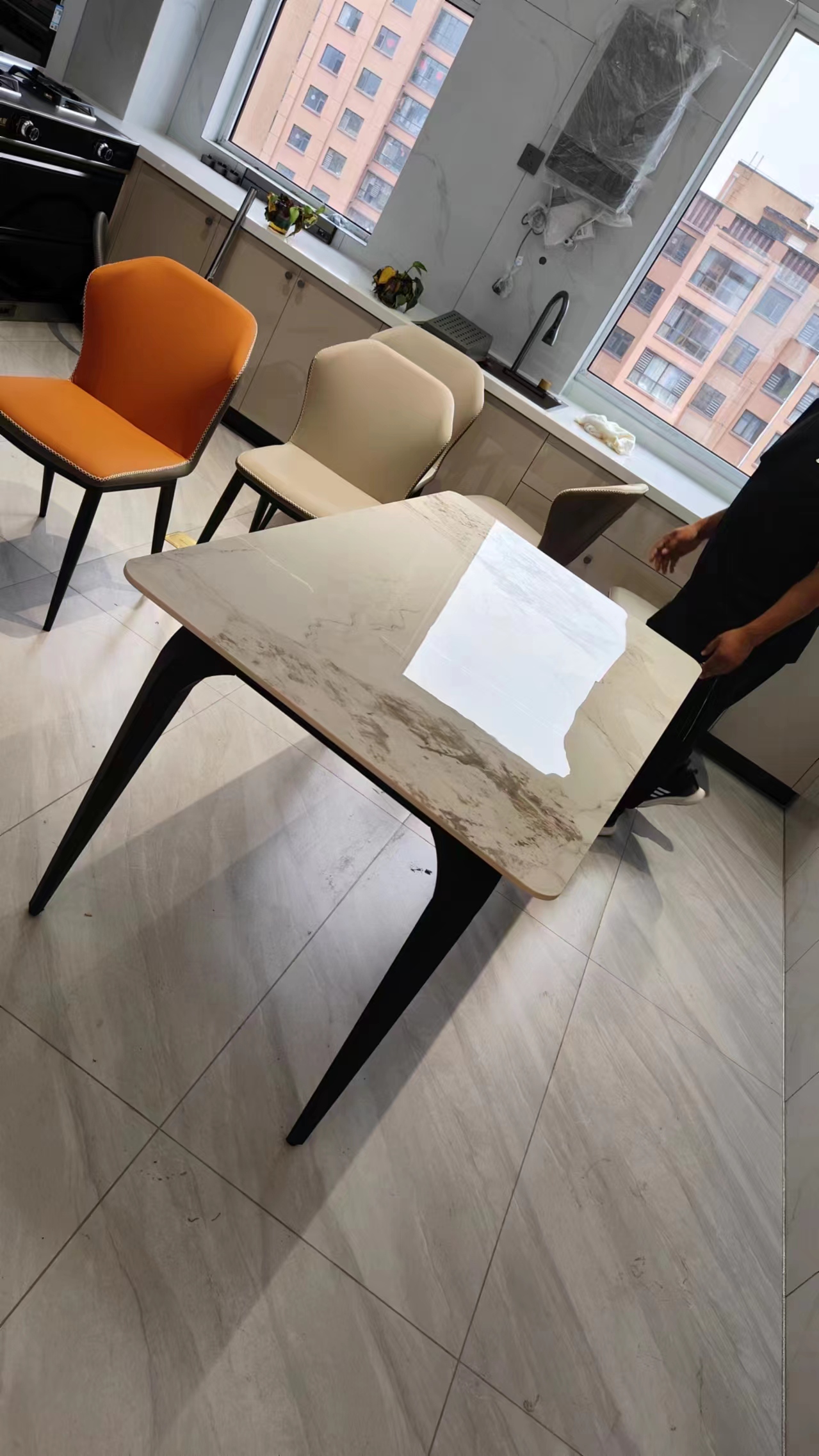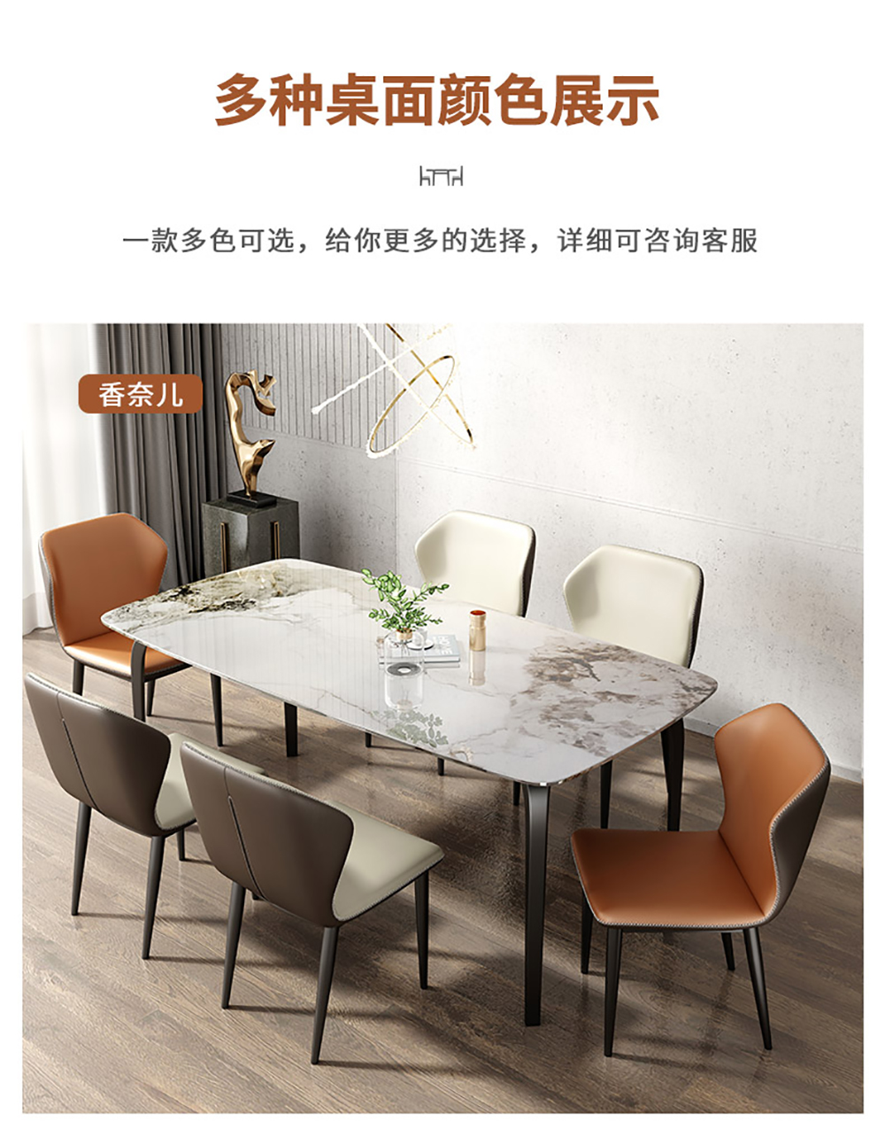 A系优选 现代简约 餐桌:岩板+碳素钢 1.4米 餐椅:西皮+墨兰紫 4把橙色 1.4米餐桌+4把餐椅 (含底板)| 商品详情 | 规格参数 | 评价(0) | 购买咨询() | 产品实拍图 | 服务标准 |