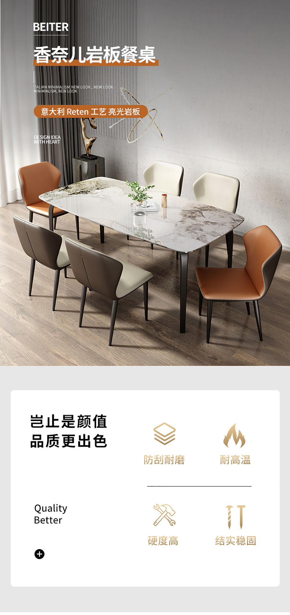 B系优选 现代简约 餐桌:12mm亮光奶油色岩板面+高密度板+烤漆+不锈钢脚 餐椅:铁艺框架+西皮靠背 1.4米餐桌+4把餐椅(含底板)