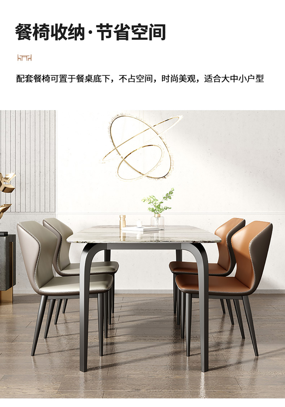B系优选 现代简约 餐桌:碳素钢底座+12mm马肚形岩板+多层板底板 餐椅:碳素钢底座+PU皮 1.4米餐桌+4把餐椅(含底板)¥4008