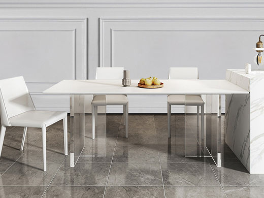云端 奶油风 亮不锈钢底架+E1板材烤漆 实木多层底板+亮光雪山石岩板 1.4米餐桌¥2032