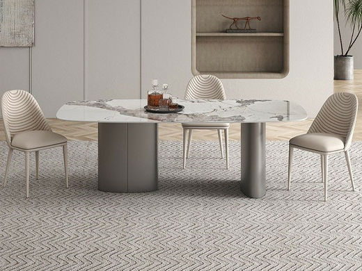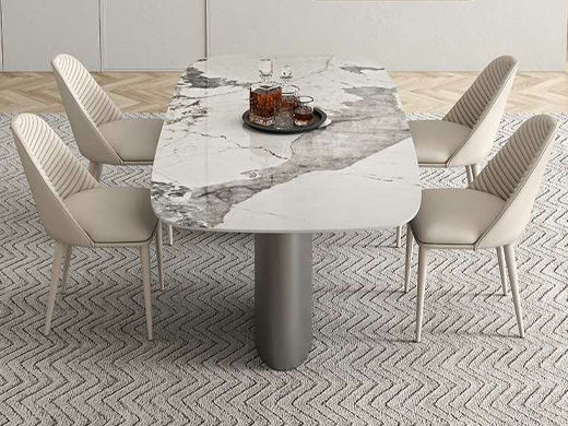 B系优选 现代简约 餐桌:碳素钢底座+12mm马肚形岩板+多层板底板 餐椅:碳素钢底座+PU皮 1.4米餐桌+4把餐椅(含底板)¥4008