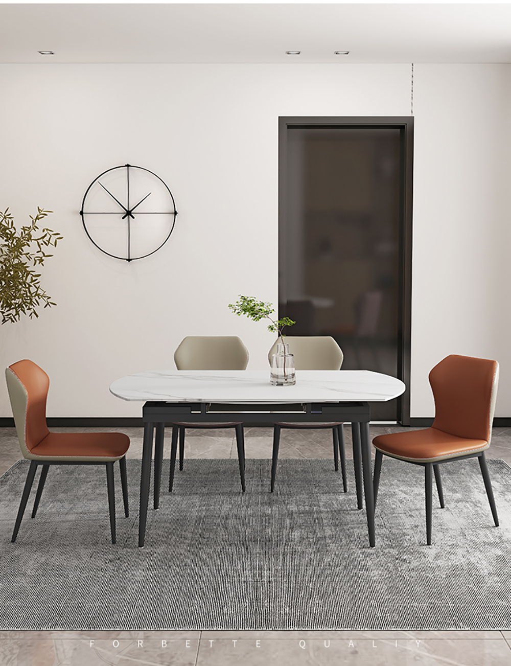 B系优选 现代简约 :碳素钢黑色+亮面岩板+功能跳台 伸缩 折叠 功能餐桌 1.3米 餐椅:西皮+墨兰紫 4把橙色 1.4米拉伸餐桌+4把餐椅(不含底板)