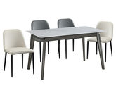 B系优选 现代简约 餐桌:12mm亮光奶油色岩板面+高密度板+烤漆+不锈钢脚 餐椅:铁艺框架+西皮靠背 1.4米餐桌+4把餐椅(含底板)
