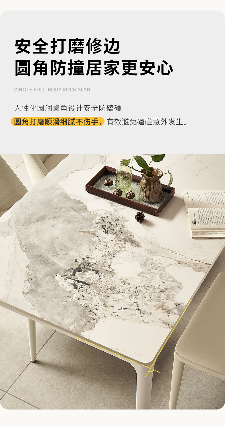 云端 奶油风 亮不锈钢底架+E1板材烤漆 实木多层底板+亮光雪山石岩板 1.4米餐桌¥2032