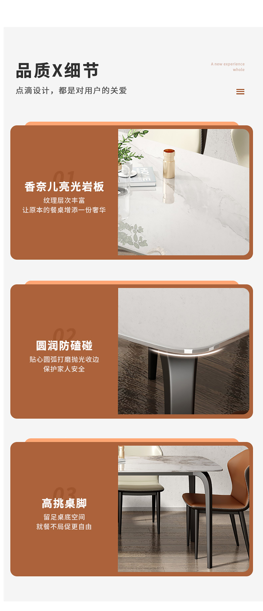 A系优选 现代简约 餐桌:岩板+碳素钢 1.4米 餐椅:西皮+墨兰紫 4把橙色 1.4米餐桌+4把餐椅 (含底板)| 商品详情 | 规格参数 | 评价(0) | 购买咨询() | 产品实拍图 | 服务标准 |