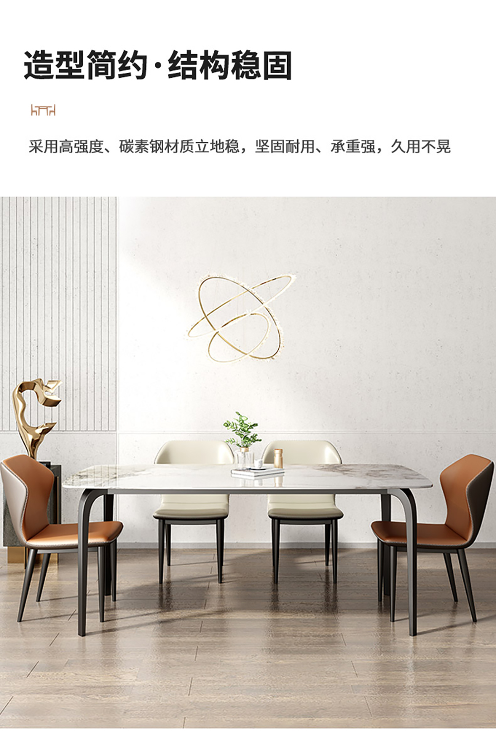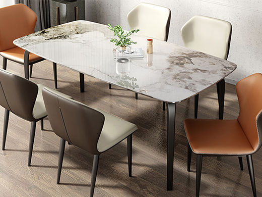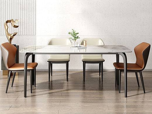 B系优选 现代简约 餐桌:碳素钢底座+12mm马肚形岩板+多层板底板 餐椅:碳素钢底座+PU皮 1.4米餐桌+4把餐椅(含底板)¥4008
