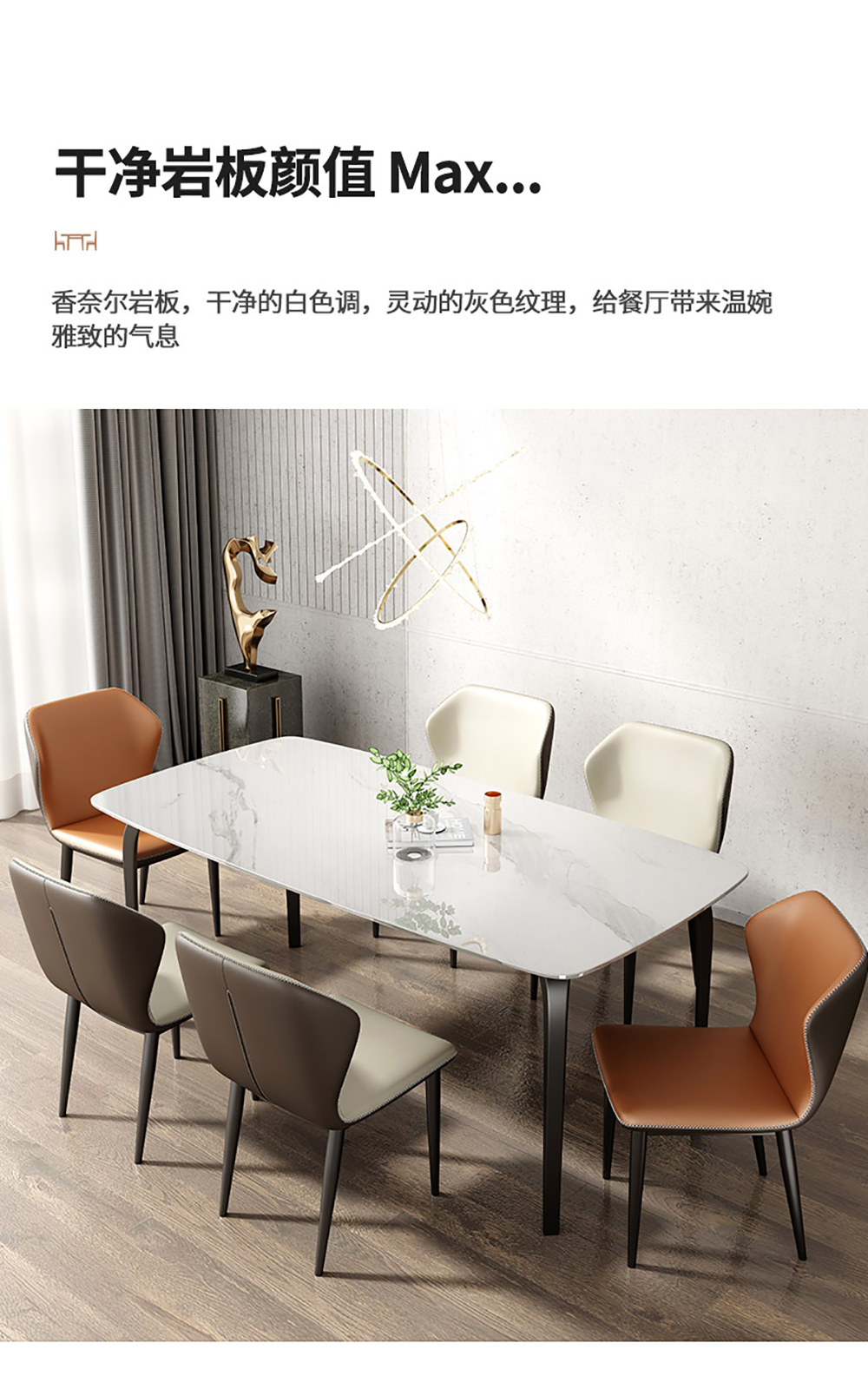 A系优选 现代简约 餐桌:3A碳素钢五金支架+12mm优质岩板 餐椅:西皮面料+太空绵+高回弹海绵+夹板+碳素钢架脚+塑胶防刮脚钉 1.4米餐桌+4椅 (不含底板)¥3402