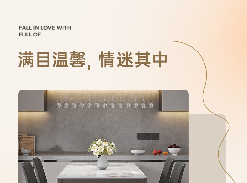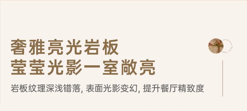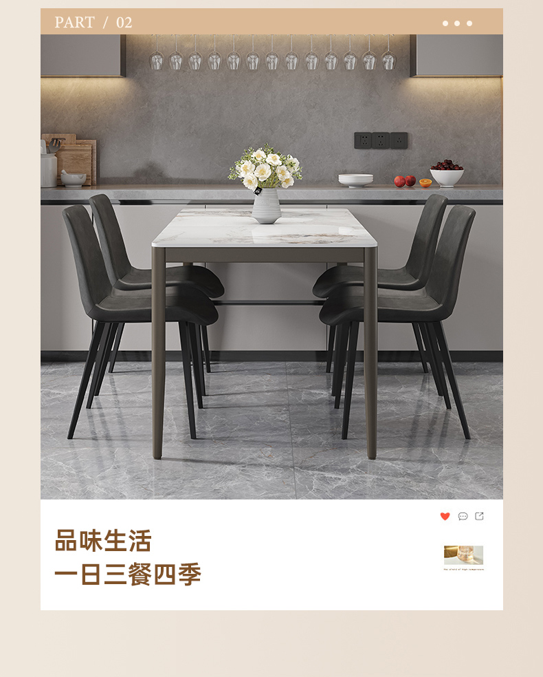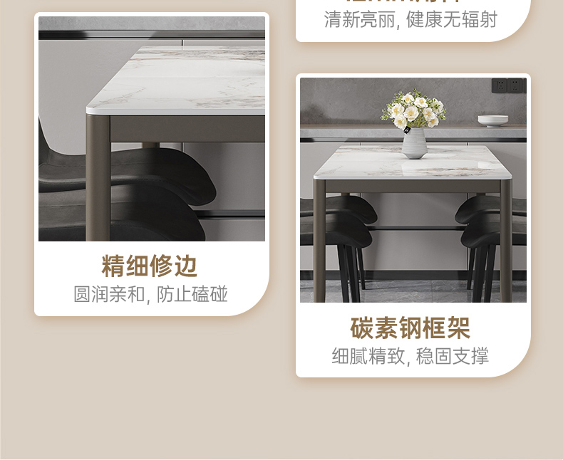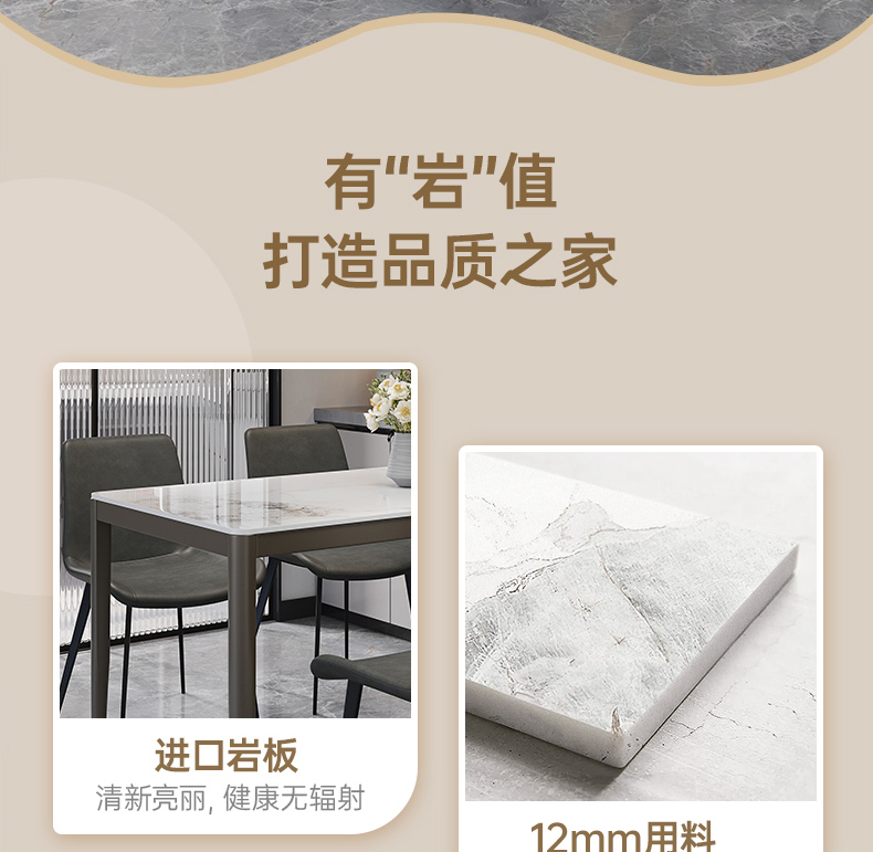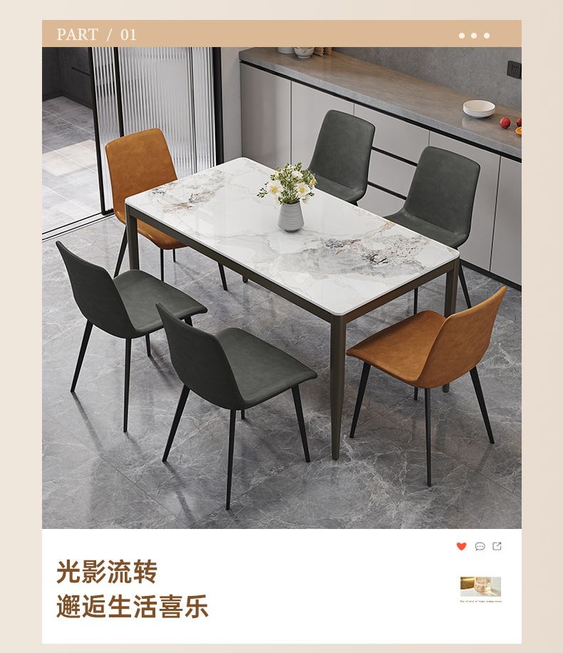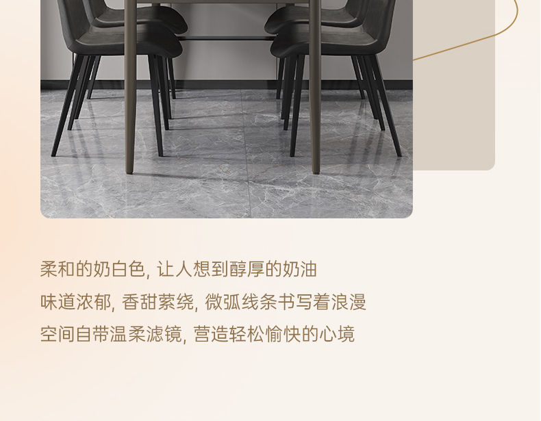 B系优选 现代简约 餐桌:12mm亮光奶油色岩板面+高密度板+烤漆+不锈钢脚 餐椅:铁艺框架+西皮靠背 1.4米餐桌+4把餐椅(含底板)¥2330