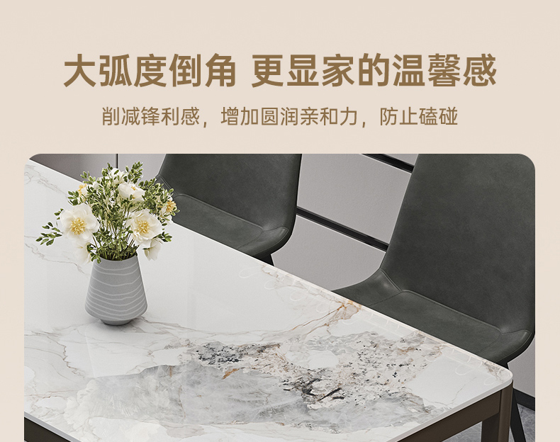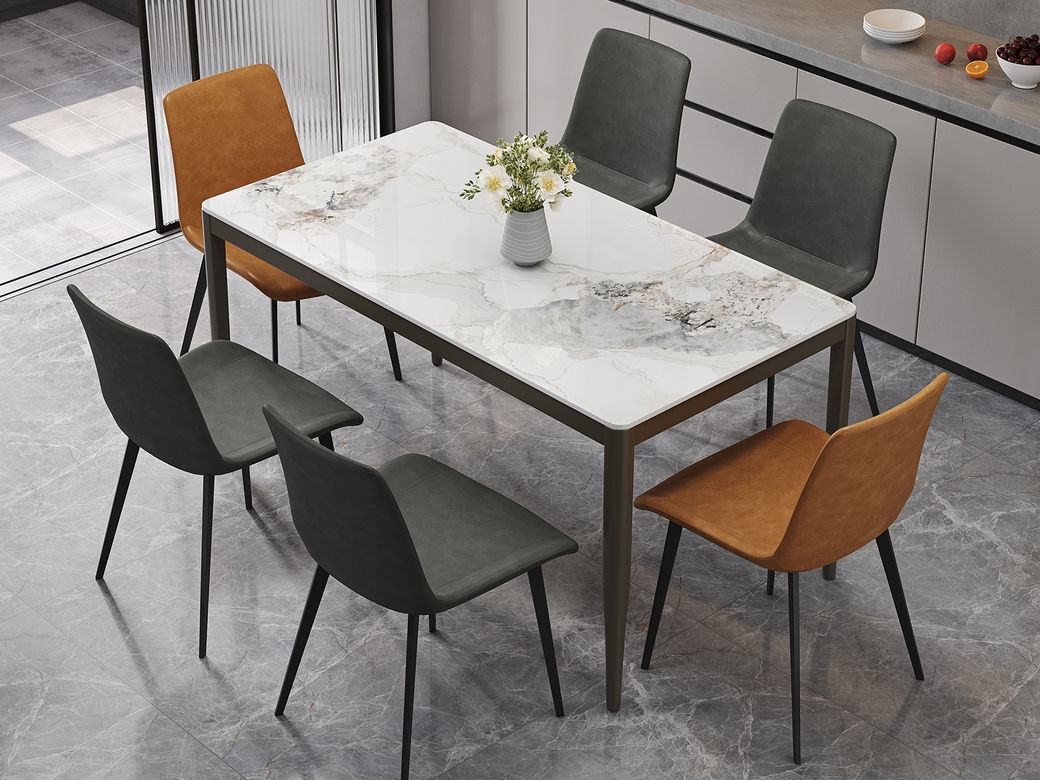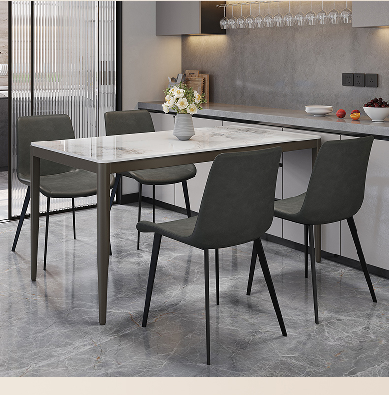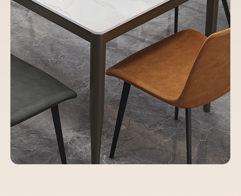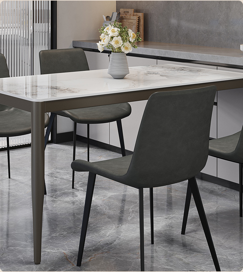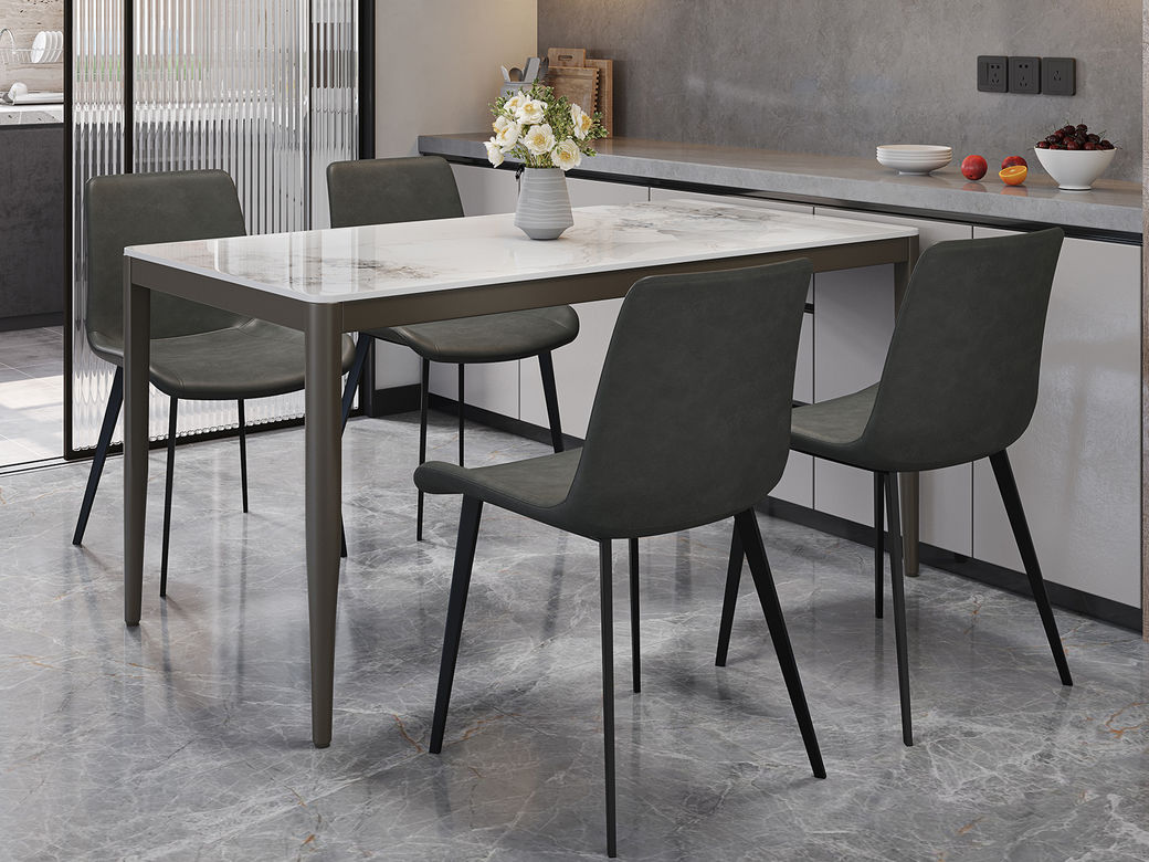 B系优选 现代简约 餐桌:碳素钢底座+12mm马肚形岩板+多层板底板 餐椅:碳素钢底座+PU皮 1.4米餐桌+4把餐椅(含底板)¥3402