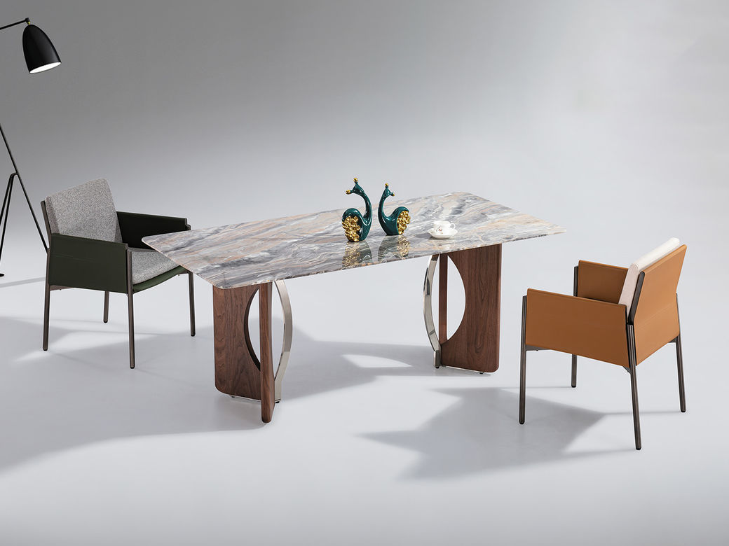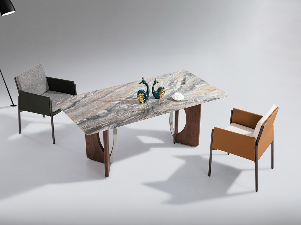 小红书系列 极简 桌面:天然石+绒布底板脚架:不锈钢本色亮光+黑胡桃 1.6米餐桌