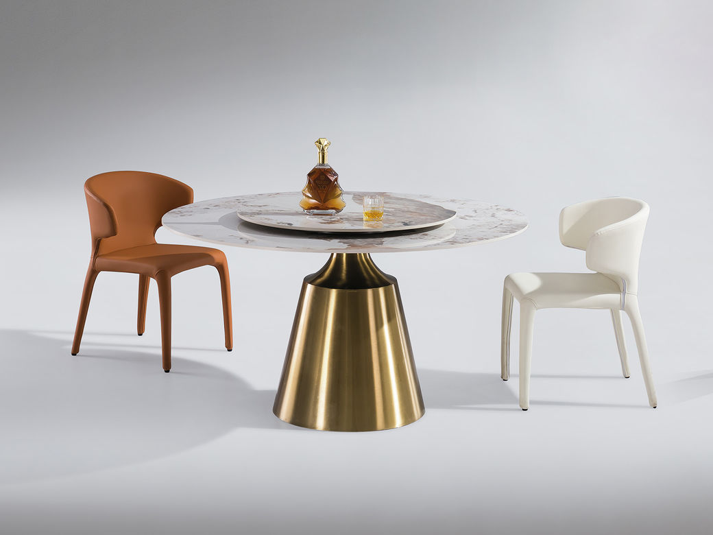 小红书系列 轻奢 桌面:岩板+底板脚架:不锈钢钛金+PU皮【配转盘】 1.35米餐桌