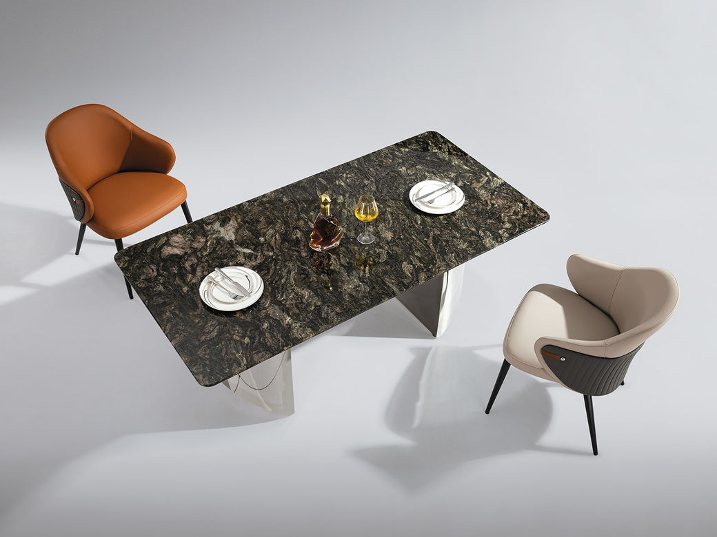 小红书系列 轻奢 桌面:天然石+绒布底板脚架:不锈钢钛金+马鞍皮 1.6米餐桌