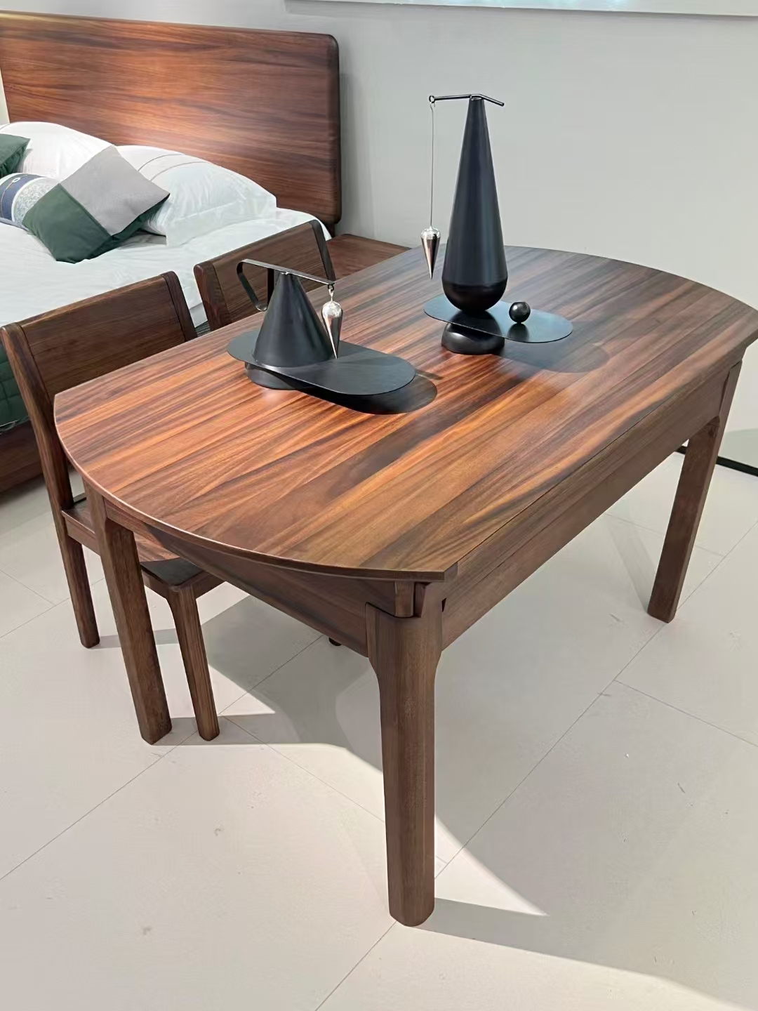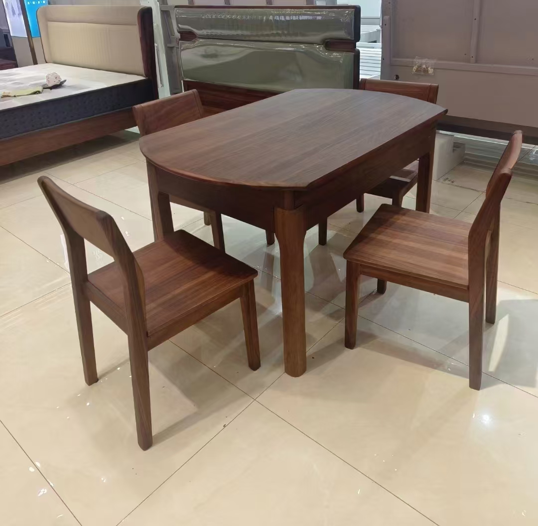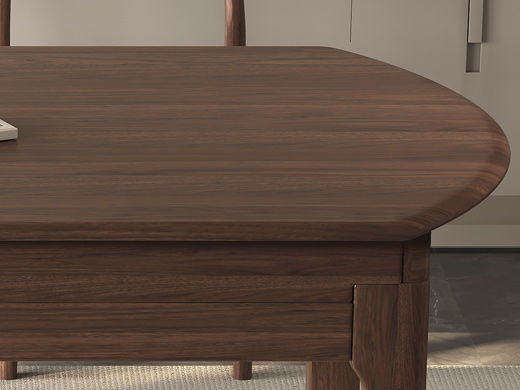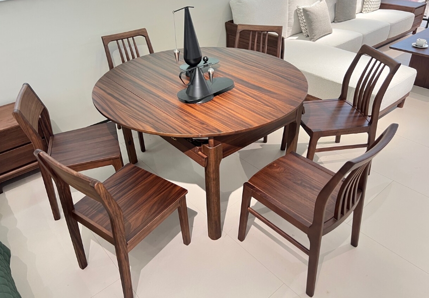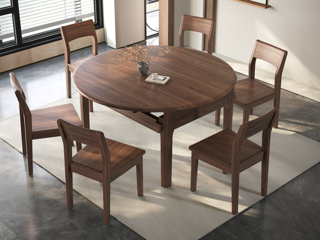 墨云阁 中古风 南美胡桃木+多层实木板 胡桃色 跳台 拉伸1.35米餐桌 |
