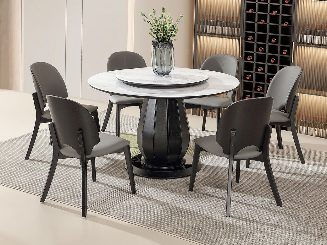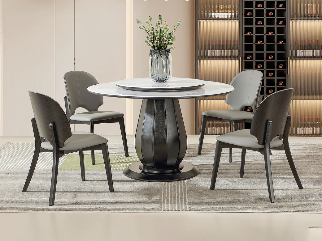 梵歌 现代简约 E1环保中纤板 环保水性漆 烟熏木皮 高密度三胺板抽屉+三节缓冲导轨 抽面3MM岩板+15MM人造大理石面 碳素钢五金脚 烟熏色 1.35米圆餐桌