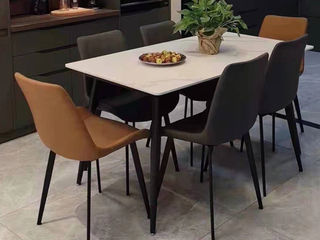 A系优选 现代简约 餐桌:碳素钢架+哑光岩板面+底板餐椅:碳素钢+西皮+高密度海绵 1.4米餐桌+4椅 (含底板)