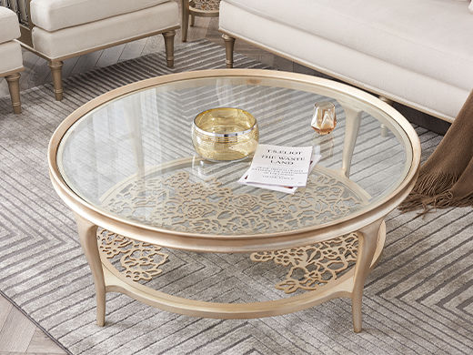 艾美侈 美式 进口榉木+银箔+镂空金属层架+ 银箔金 1.17米圆形咖啡桌茶几
