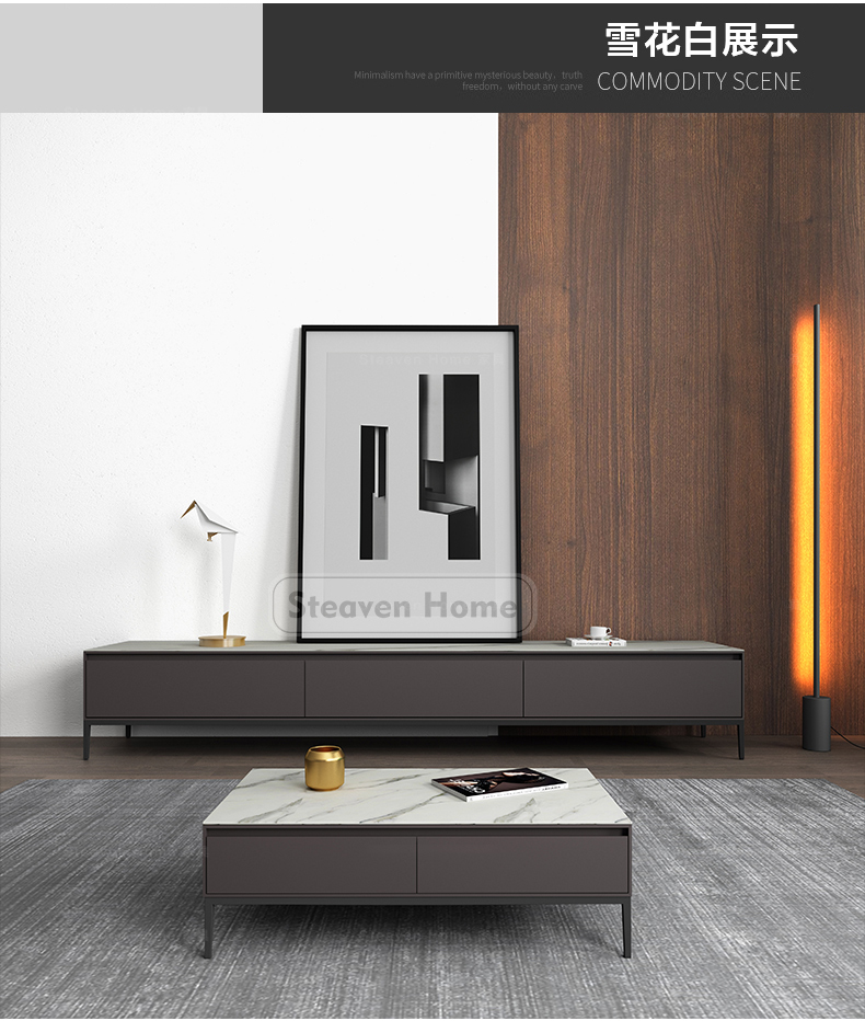 B系优选 现代简约 E1板材黑色实木铁皮+哑光雪山石+维克灰岩板面,实木抽屉+碳素钢底架 0.8米组合茶几¥2330