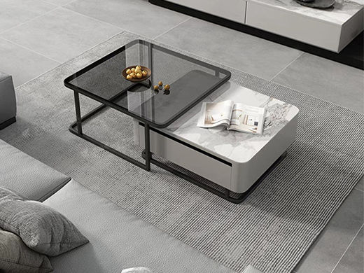 B系优选 现代简约 中纤板(MDF)亮光烤漆+碳素钢脚架+岩板台面+黑茶钢化玻璃+实木松木抽屉 香奈儿 0.8米组合茶几