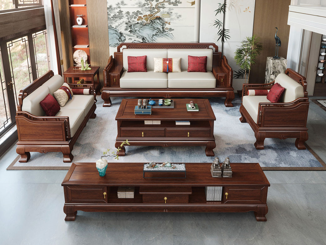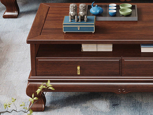 宝瑞·檀风 新中式 印尼金花梨木框架+多层实木板贴皮 紫檀色 1.45米茶几¥2710