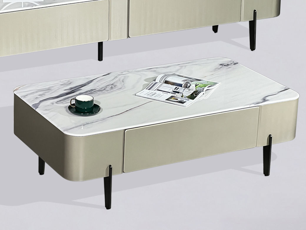 甄品家具 现代简约 安卡拉白亮光微晶石7.5MM+香槟色拉丝工艺+电镀脚 1.3米茶几
