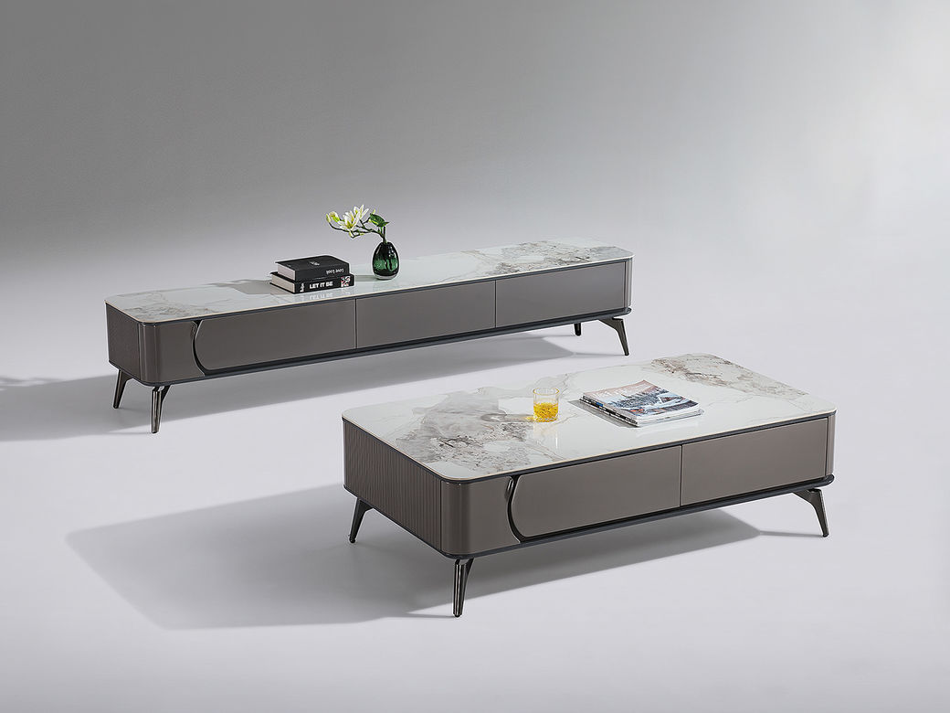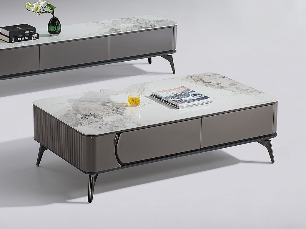 甄品家具 现代简约 烤漆柜体+亮光雪山石岩板面+枪色五金脚架 1.3米茶几¥2304
