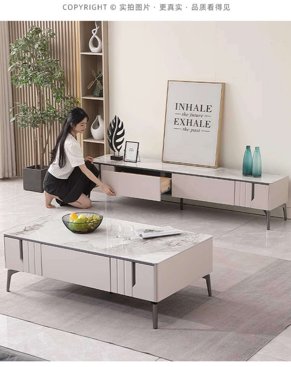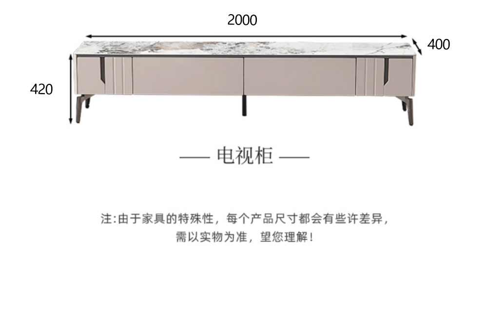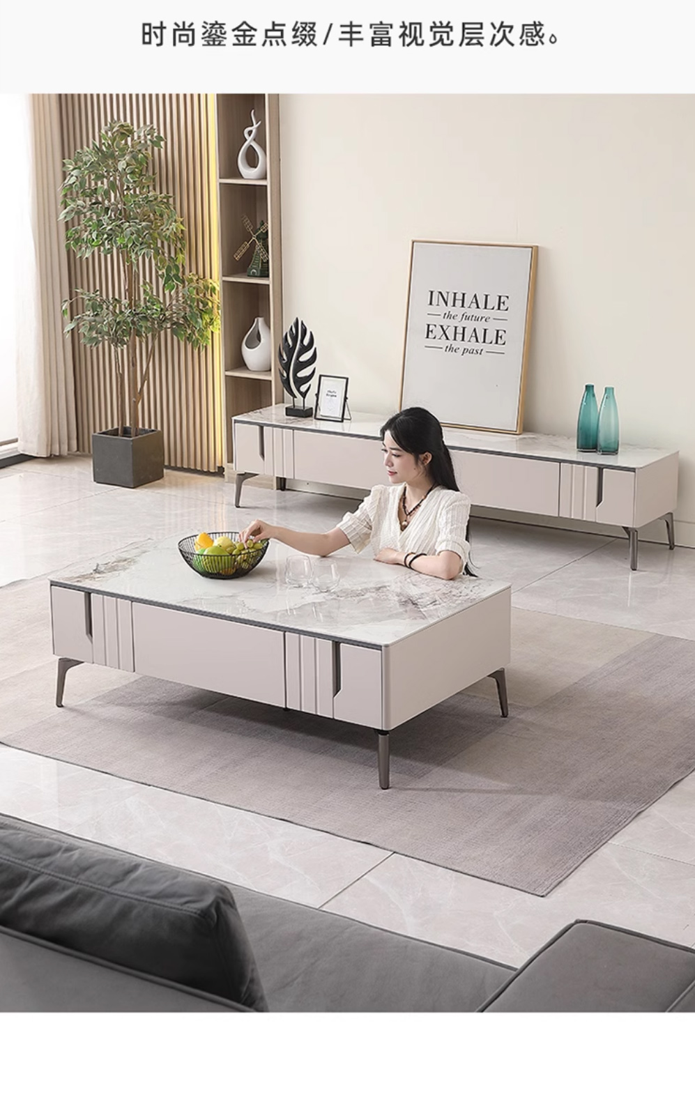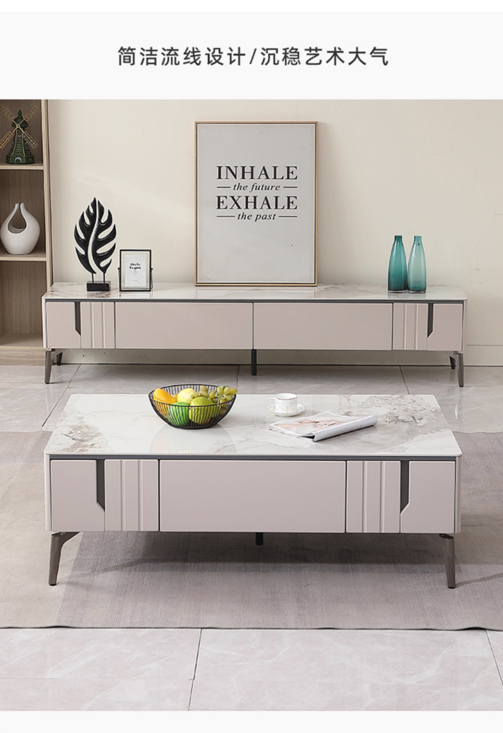 【套餐专享价】每屋优享系列 现代简约 岩板+密度板+碳素 钢五金脚 1.25米茶几+2米电视柜(未开电源孔)