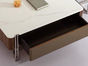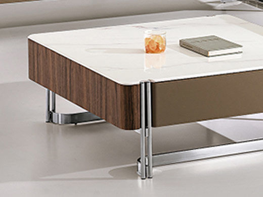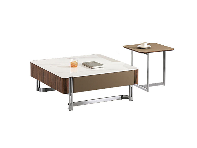小红书系列 现代 茶几:胡桃木皮柜身+马鞍皮双抽+不锈钢底架+罗曼蒂克石面 边几:马鞍皮面板+不锈钢底架 0.9米组合茶几