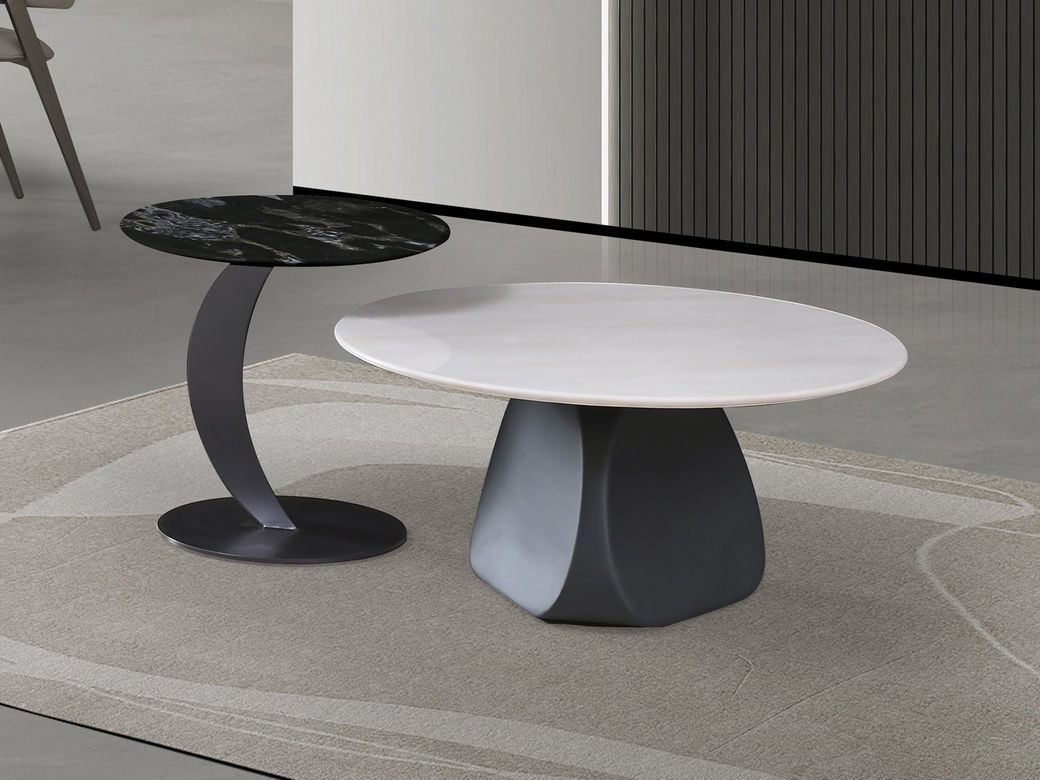 皇朝家居 现代极简 饰面大理石+玻璃钢喷金属漆 圆形 0.9米0.9M茶几皇朝家居 现代极简 碳钎维玻璃钢材质+黑钛金属肤感漆+8MM厚碳素钢板+18MM天然大熊猫白搭配普拉达绿大理石贴纸 圆形 0.58米角几