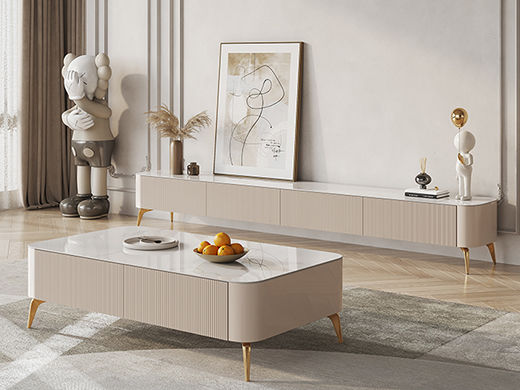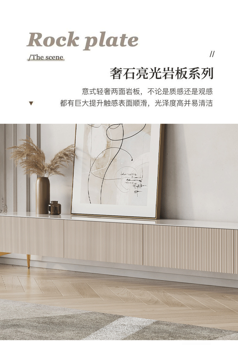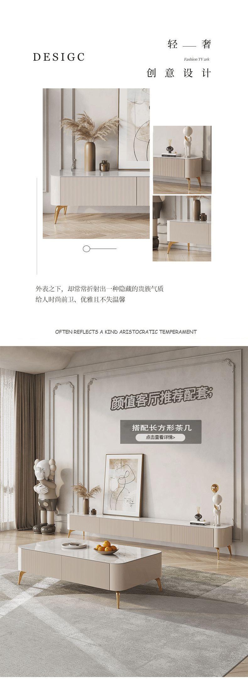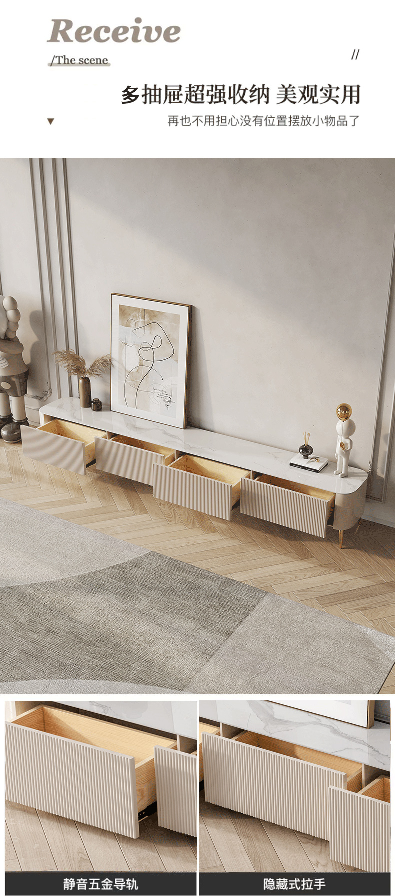 B系优选 现代简约 亮光岩板+亮光烤漆柜子 钛金五金底架+实木抽屉 卡其色 1.3米茶几¥2330