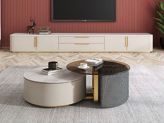 非凡工艺 现代简约 中纤板 亮光烤漆+碳素钢脚架+岩板6mm+8mm茶色钢化玻 卡塔金+奶油色烤漆 组合圆茶几+2米电视柜