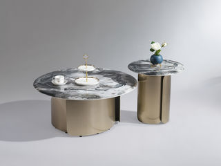 小红书系列 现代 茶几:胡桃木皮柜身+马鞍皮双抽+不锈钢底架+罗曼蒂克石面 边几:马鞍皮面板+不锈钢底架 0.9米组合茶几