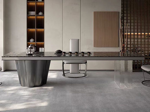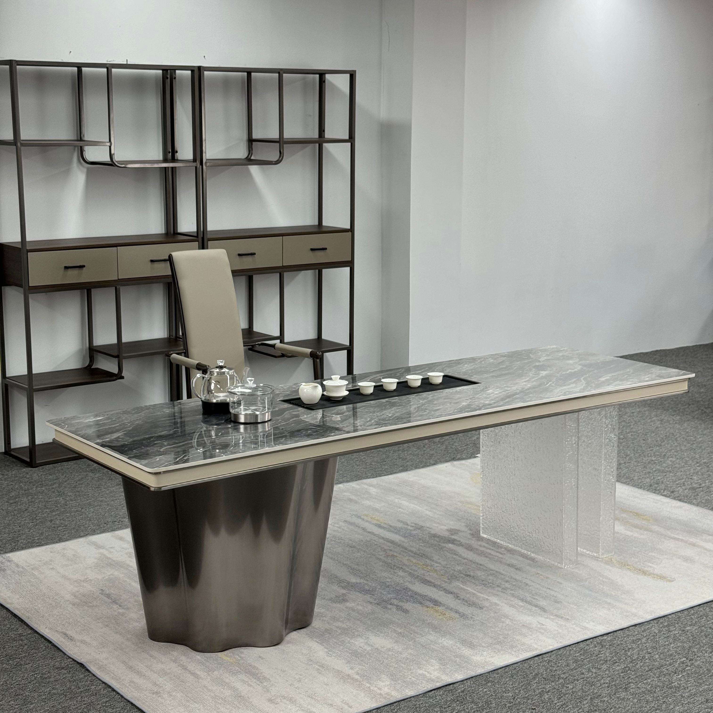 上铭轩 轻奢 岩板威尼斯棕+亚克力+碳素钢五金+电茶炉(不含椅子,茶具) 2米岛台 茶台